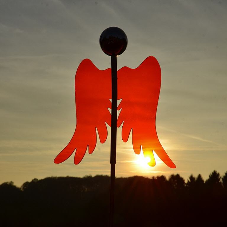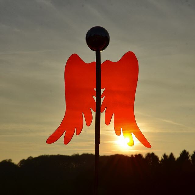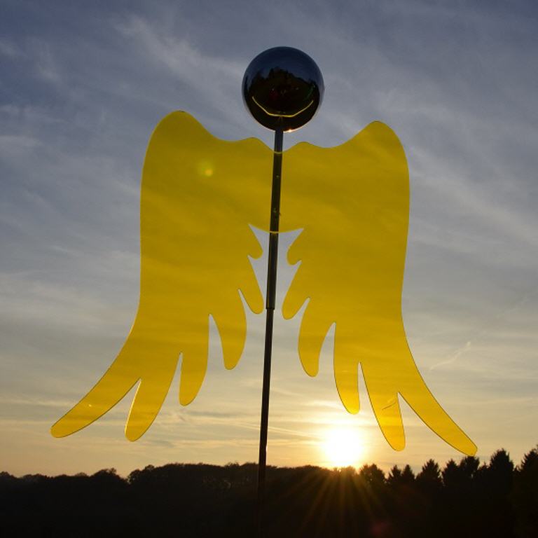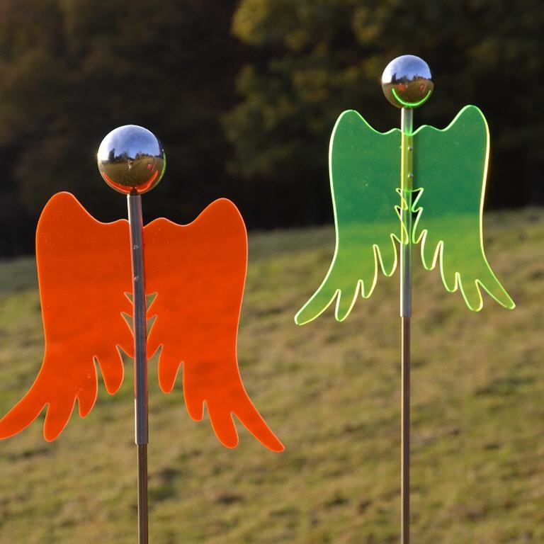 Unsere Gartenstecker sind aus Edelstahl und fluoreszierendem Acrylglas hergestellt. Das Material ist ein Lichtsammler, d.h. es fängt das unsichtbare UV-Licht und gibt es als leuchtende Farbe wieder. Dafür ist zwar Tageslicht erforderlich, aber kein Sonnenschein. Besonders in den Zeiten, wo wenig Sonne scheint, leuchten die Scheiben sehr intensiv.