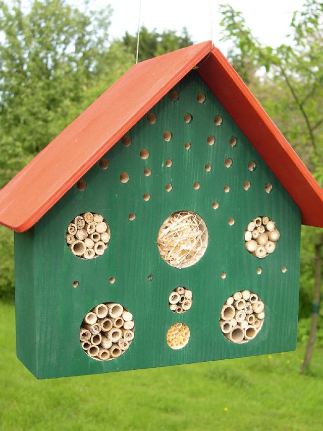 Die Tiere finden Unterschlupfmöglichkeiten in den verschieden großen Löchern und in den anderen Materialien (Schilf, Holzwolle, Stroh). Hier findet von der Wildbiene bis zum Marienkäfer jeder sein Zuhause.