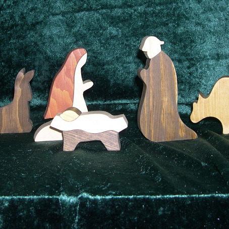Die Krippenfiguren sind aus Kiefernholz hergestellt. Die einzelnen Teile werden unterschiedlich farbig lasiert und zusammengesetzt. Diese sehr aufwändige Arbeit lohnt sich, wenn man das Ergebnis sieht.
