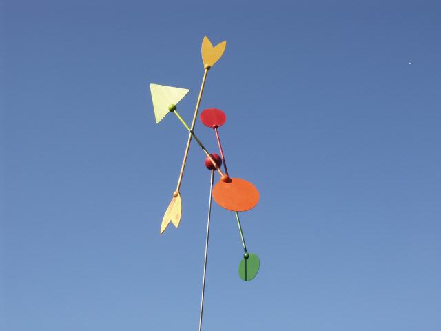 Ein farbenfrohes Windspiel, dass aus verschiedenen Formen besteht mit 3 Flügeln, die sich beim kleinsten Windhauch in Bewegung setzen. Das Windspiel ist aus wetterbeständigem Flugzeug-Sperrholz gefertigt, die Gleitlager sind aus Edelstahl.