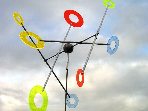 Windspiel mit Ringen in unterschiedlichn Farben. Dieses Windspiel ist aus fluoriszierendem Acrylglas hergestellt. Es hat 4 gegeneinander laufende Flügel.