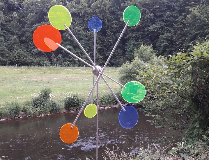 Windspiel aus Acrylglas, Gleitlager aus Edelstahl. Die Flügel des Windspiels drehen sich beim kleinsten Windhauch gegeneinander. Die Kreise sind in verschiedenen Farbkombinationen erhältlich.