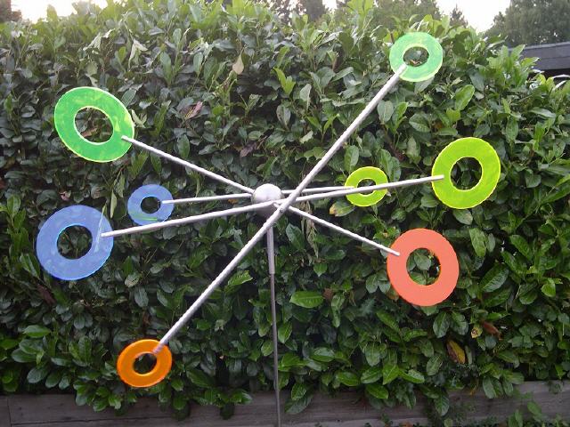 Windspiel mit Ringen in unterschiedlichn Farben. Dieses Windspiel ist aus fluoriszierendem Acrylglas hergestellt. Es hat 4 gegeneinander laufende Flügel.