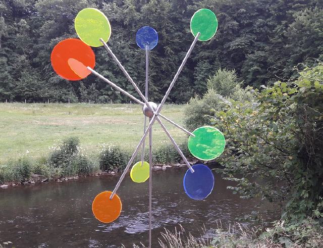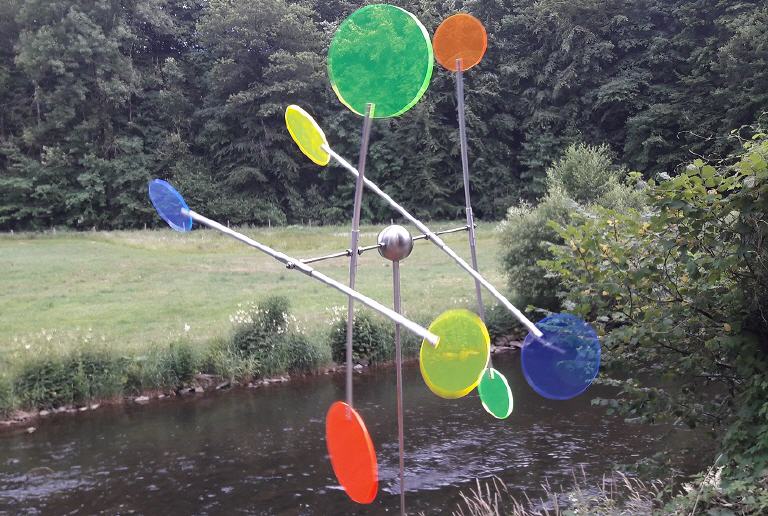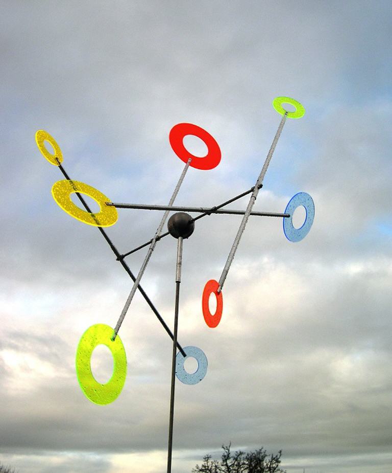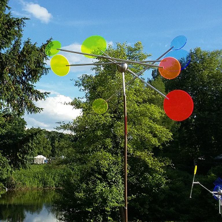 Die Flügel des Windspiels drehen sich beim kleinsten Windhauch gegeneinander. Die Kreise sind in unterschiedlichen Farben erhältlich.