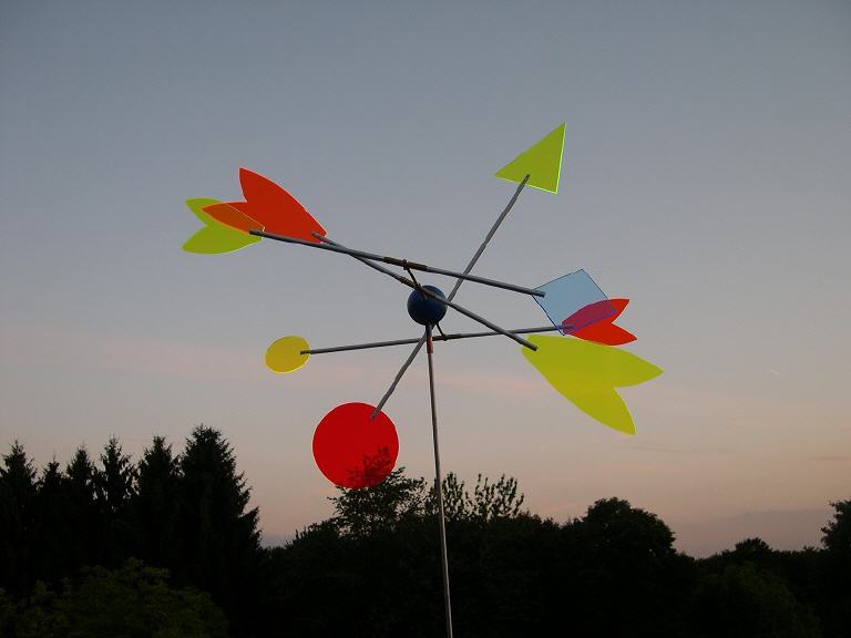 Dieses Windspiel ist aus fluoriszierendem Acrylglas hergestellt und hat 4 Flügel. Das Material ist ein Lichtsammler, d.h. es fängt das unsichtbare UV-Licht und gibt es als leuchtende Farbe wieder. Dafür ist zwar Tageslicht erforderlich, aber kein Sonnenschein. Besonders in den Zeiten, wo wenig Sonne scheint, leuchten die Scheiben sehr intensiv. Durch die ständige Bewegung verwandelt sich der Lichteinfall und das Windspiel sieht immer wieder anders aus.